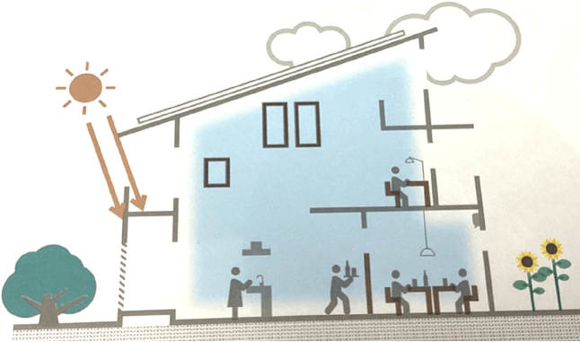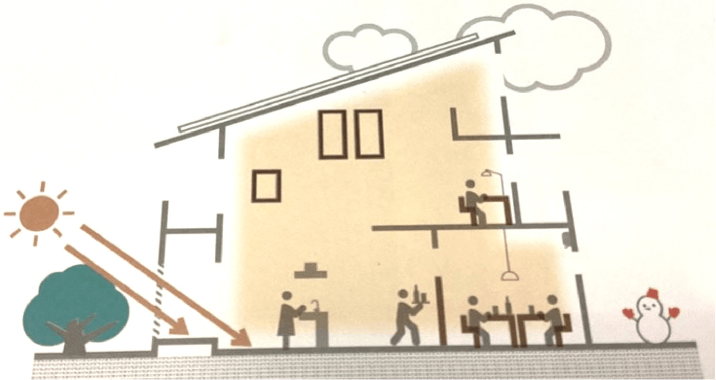 カイ・ハウジング建設では、パッシブデザインと合わせて独自の空錠循環システム(排熱と冷却)の採用で建物の高断熱化による夏のオーバーヒートを防ぎ、冬には日射エネルギーを最大限に取り込みます。